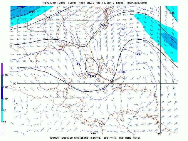 The GFS, Euro, and Canadian all appear to be in decent agreement in phasing 99L with an upper level trough (shown over the Florida Straits in this image with 99L over the central Bahamas) towards the end of this week. This results in 99L becoming a larger system and in deepening of the system—which would likely become sub-tropical after a merger with a cold-core upper level trough.