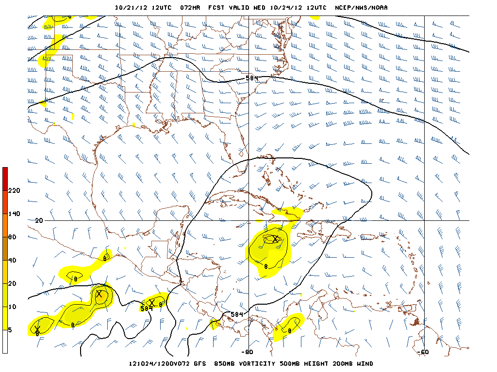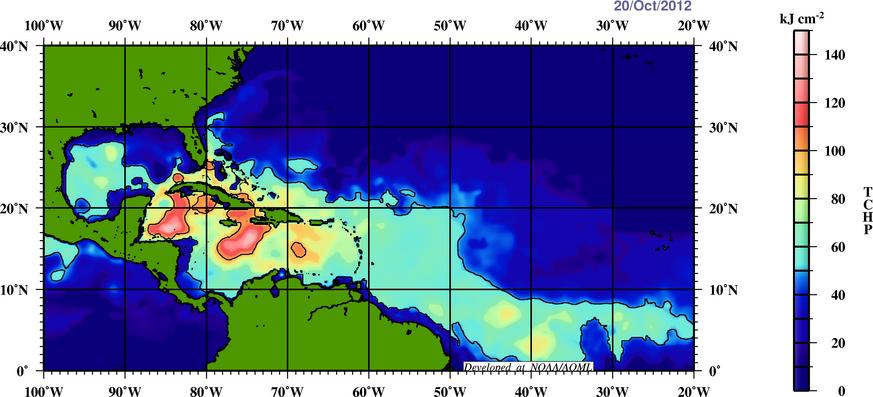 There are hints that as the low pressure area sits near or south of Jamaica that it will be in a favorable upper level environment with low wind shear and good upper level outflow. As can be seen above, the 3-day GFS projection shows 10-20kt upper level winds over 99L with a belt of sub-tropical westerlies venting the system. In addition, even though we are approaching November, waters in the western Caribbean still contain a ton of heat: