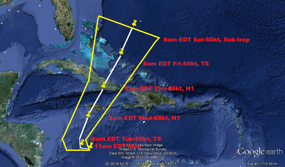 This 5-day animation of the GFS shows that upper level winds (barbs on map) remain in the 10-20 knot range over the system until it approaches Cuba, before increasing significantly. Due to the very warm waters under the system, and the expectation that 18L will have about 48 hours of light to moderate wind shear and good upper level divergence, if 18L can consolidate a bit further today and tonight it may overperform and become a strong system before shear begins to take its toll in about two days and Cuba shortly thereafter. Will somewhat blend the idea of a more robust system with current ATCF intensity guidance and show 18L becoming a minimal hurricane before impacting Cuba.