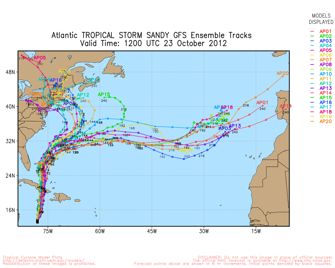 The GFS ensembles, above, are split in what they want to do with Sandy. 9/20 members take Sandy into the NE US, 10/20 members match the op GFS and take Sandy well out to sea, and 1 member appears to be heading back towards the US at the last second. This indicates the operational GFS, which does not handle the N. Atlantic ocean low like the other models, may be in error in weakening the ocean low and tracking Sandy well east.