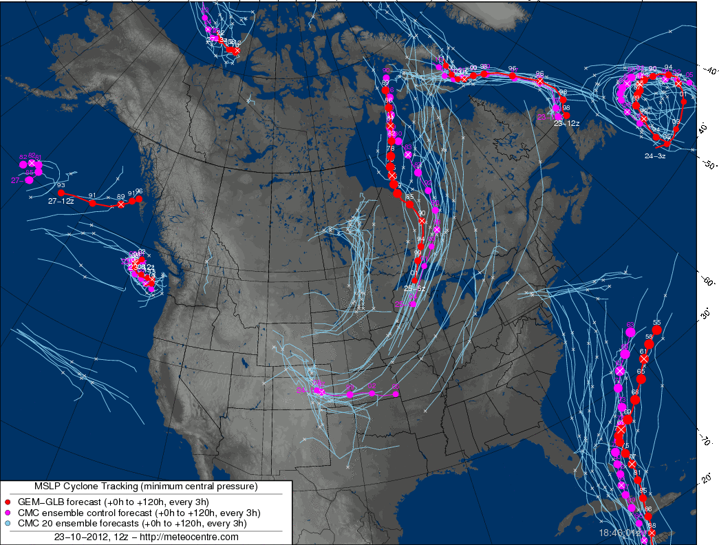 -As we look at the North Atlantic, the GGEM ensembles, in general, are weaker with the blocking Sunday morning than the other two ensembles. This may indicate that the GGEM model’s fast speed with Sandy is an outlier.