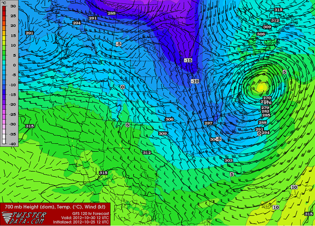 If Sandy is able to maintain a strong warm core as it heads northward into early next week, the warm core will be caught under and upper level trough and surrounded by cooler air aloft, as shown above on the GFS. This will allow for a tremendous amount of lift with Sandy due to the buoyant nature of warmer air.