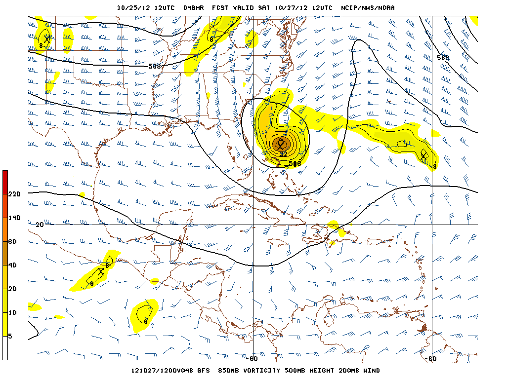 As Sandy is captured, the low pressure aloft associated with Sandy will combine with the lower pressure aloft created by the incoming trough, to result in pressures, or “heights” aloft to fall dramatically near and over Sandy as it approaches the US coastline. In addition, the mid-level spin, or “vorticity” within Sandy and the trough will combine and create a large amount of vorticity aloft as shown above by the color-fill. This vorticity aloft will also enhance lift.