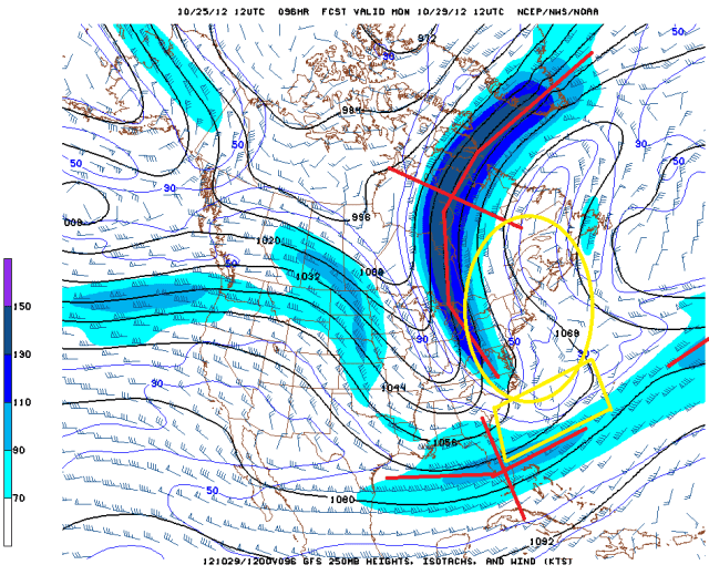 Two potent jet streaks, shown above by the blue color-fill, will be positioned to provide for a huge amount of lift over the entire Mid Atlantic, Northeast, and near-shore waters as Sandy approaches.