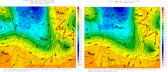 - The main difference seems to be the strength of ridging stretching between the ocean low over the open Atlantic and Sandy. The camp that takes Sandy farther north show slightly weaker ridging in this region. The camp that takes Sandy into the Delmarva region show stronger ridging. The GFS (left) and Euro (right) are posted above to illustrate this difference.