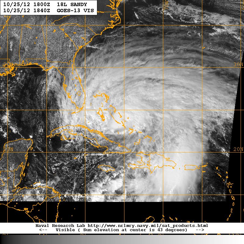 After ravaging eastern Cuba as a strong category 2 hurricane last night, hurricane Sandy is zigzagging her way through the central Bahamas with sustained winds of greater than 100MPH. Rain bands from Sandy are also brushing up against the southeastern coast of Florida as the hurricane passes by to the east. Although Sandy is still purely tropical with a tight core of intense winds over the central Bahamas, the hurricane is beginning to interact with an upper level trough which is why the hurricane has such a large mass of clouds associated with it.