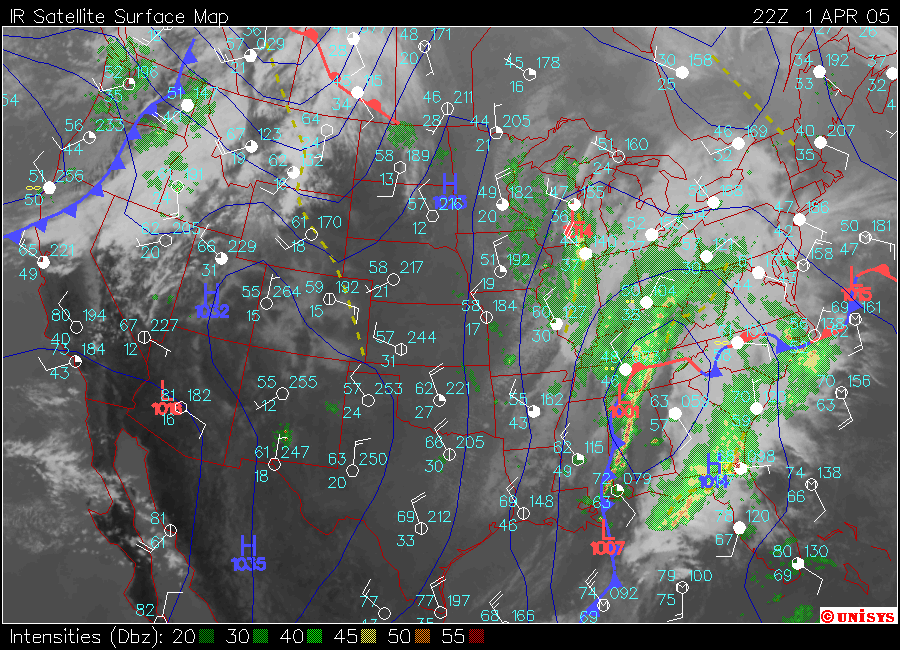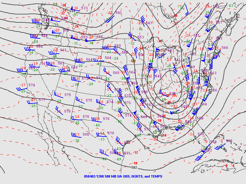 Although wavelengths tend to shorten in the spring, similar principles still apply. As we look at the 500mb chart, representing the weather pattern at 18,000 feet on 4/1/05, it is evident that there is ample western US ridging for trough amplification over the central US. This, combined with higher heights than normal over eastern Canada and Greenland, which aren’t readily visible on this map, ensured that the trough would not be in any hurry to move east and allow mild air to return to the Midwest, Great Lakes, and Ohio Valley in early April of 2005.