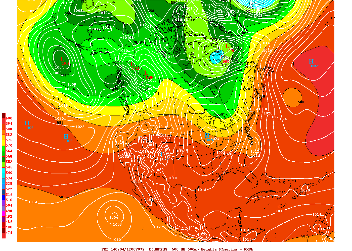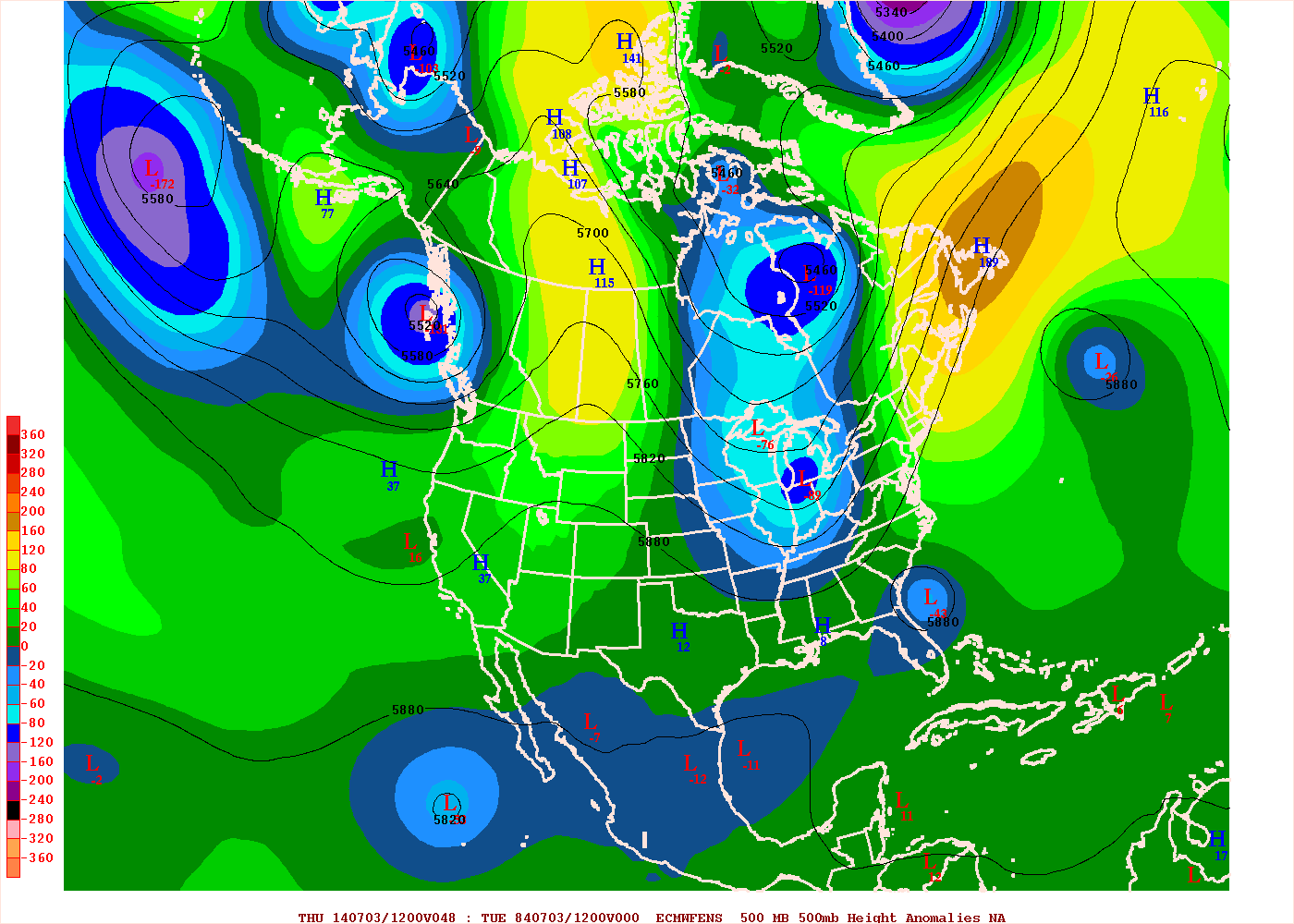A look at the pattern shown on the European ensembles for Thursday morning shows the aforementioned trough approaching the eastern US and getting ready to begin accelerating Arthur to the northeast and eventually out to sea. However, there are modestly above average heights across the northwestern Atlantic, which allows the trough to slow down and take on a modest negative tilt over the Great Lakes and Ohio Valley. If this occurred, it may still allow the western portion of the guidance envelope shown above to play out.