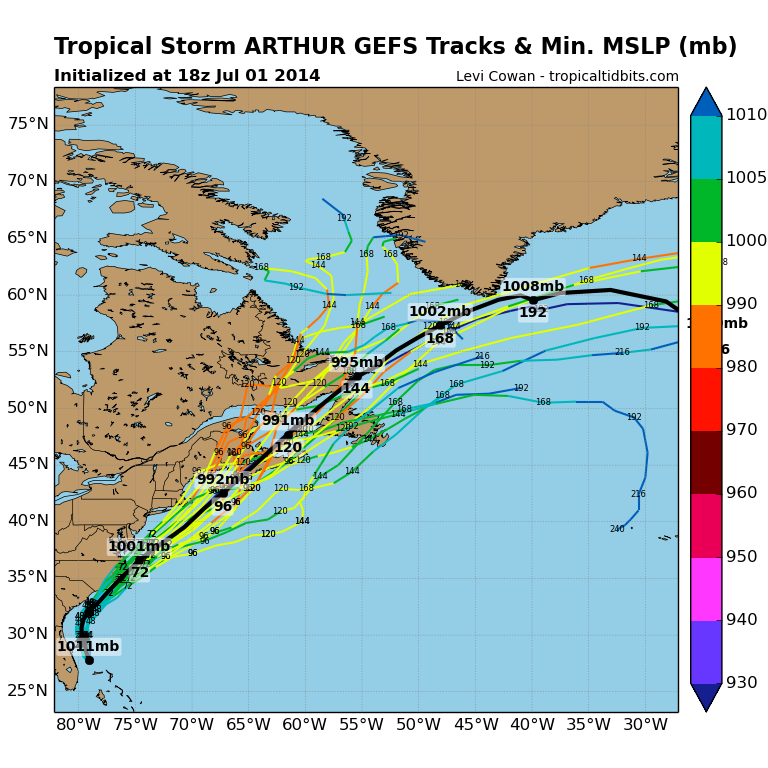 The GFS ensembles (tracks shown above) agree with the European ensembles on the pattern that will steer Arthur over the next several days, and have several members that take Arthur inland over North Carolina. Some of the members are likely way too far west (a New England impact is extremely unlikely at this point), but the ensembles in general are farther west than the hurricane models with the track of Arthur.