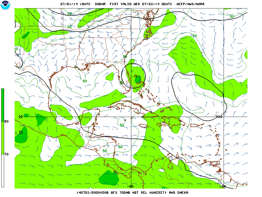 Looking at the 18z GFS run valid Wednesday evening, the model shows good upper level outflow persisting. Note how the wind barbs essentially rotate around Arthur (the yellow blob off of the Florida coast), and don’t pierce threw it. This suggests Arthur will be in a good upper level environment for intensification for at least another 24 hours.
