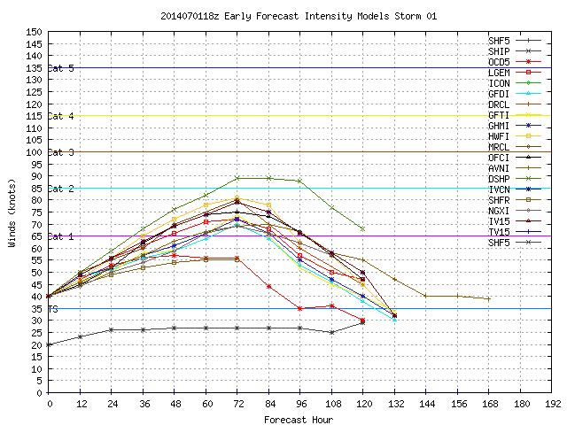 Most intensity models bring Arthur up to category 1 intensity by Friday before weakening, with the SHIPS model bringing it up to category 2 intensity. Given radar/satellite trends mentioned above, the expected favorable environment through early Friday, and marginally deep warm waters off of the southeastern coast, I’m inclined to lean towards the higher end of this intensity guidance. This means Arthur could become a category 2 hurricane for a time Thursday night or Friday before weakening. If current organizational trends continue, Arthur could become a hurricane by Wednesday evening.