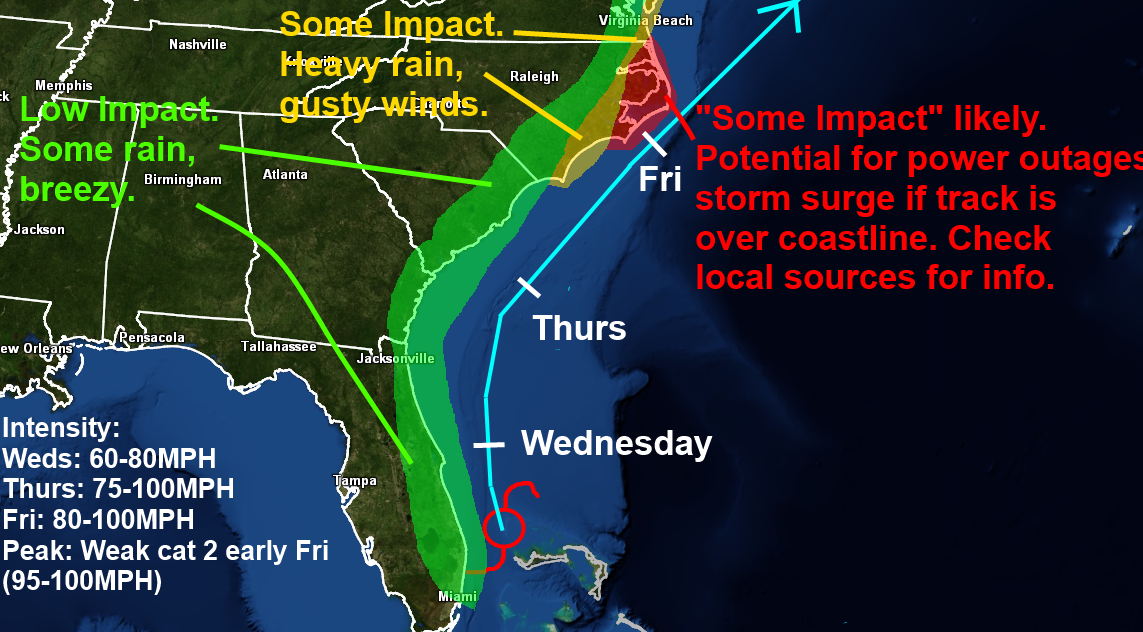 The most recent update of the hurricane models remain tightly clustered in showing a track over or extremely close to the Outer Banks, with a track close enough to bring at least mild impacts to coastal South Carolina and eastern North Carolina. A track like this would likely have minimal impacts along the East Coast north of southeastern Virginia, save for perhaps some wind/rain for Long Island and Cape Cod Friday night into Saturday morning.