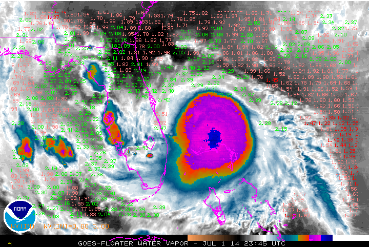 In yesterday’s post, I discussed how there was dry air in close proximity to the surface circulation associated with Arthur. This is less of an issue tonight. Water vapor imagery shows that mid-upper level dry air that yesterday was impinging on the surface circulation of Arthur has been mixed out. Precipitable water values are now safely over 2” well outside of Arthur’s central dense overcast. This shows that the persistent convection associated with Arthur for the last 24 hours or so has mixed out the dry air near the center of circulation, as the updrafts containing warm, moist air literally transport moisture from the ocean into the upper atmosphere. If shear stays low, dry air won’t be a significant issue for Arthur going forward.