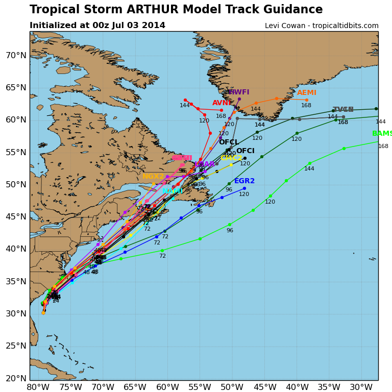 Most of our hurricane models now show Arthur coming within 20-50 miles of the North Carolina coastline from Wilmington points east, with about half of the models showing a track over or even inside of the Outer Banks. Note how yesterday, all of these models (barely) kept Arthur off shore.