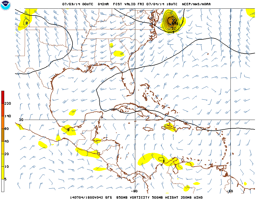 A look at this evening’s GFS model valid Thursday evening shows that the model depicts a much better divergent flow over Arthur by Thursday evening. However, westerly winds would begin to approach levels that would shear the storm.