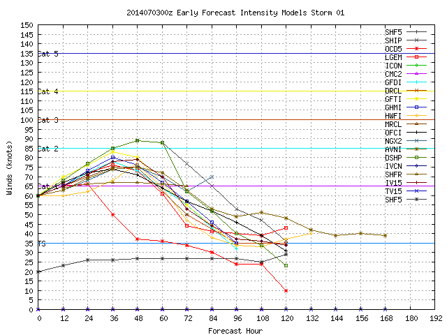 As we move forward to Friday afternoon, the GFS appears to show westerly winds beginning to make it through to the core of Arthur, which would likely begin a weakening and extra-tropical transition of the cyclone. This indicates that Arthur has between now and Friday morning to intensify before shear associated with the trough moving into the eastern US begins to become prohibitive. If Arthur moves over the Carolinas between now and Friday afternoon, that would obviously halt intensification sooner.