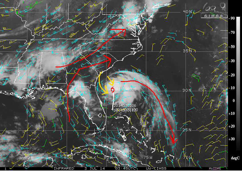 A look at the upper level winds surrounding Arthur show that there is a very strong equator-ward outflow channel, which essentially removes the air from above Arthur and promotes intense rising motion within the storm. However, there is still a little bit of northwesterly shear affecting Arthur. Although this shear is pretty weak, it is JUST enough to entrain some dry air from over the Carolinas into Arthur’s core, which has kept the storm from closing off an eyewall today. However, southwesterly winds associated with an incoming longway trough are beginning to approach Arthur, which will likely help cause outflow to develop on the pole-ward side of Arthur, eliminate the westerly shear, and give Arthur an opportunity to strengthen more significantly through early Friday.