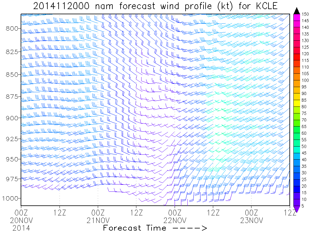 A BUFKIT “graph”…yellow line is the equilibrium level (45F water temp used)…scale is on the right…white line is lake-induced CAPE (scale is on the far left)…lines are winds between 910mb and 850mb (in degrees, scale is on the left):