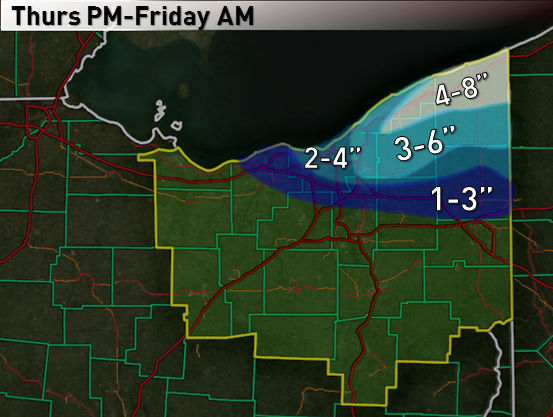 For amounts…went with a quick 1-3” in western Cuyahoga/northern Lorain as the trough swings by…a quick 2-4” from eastern Cuyahoga east…and a bit more in northern Ashtabula where the band may start affecting sooner. After that, went with additional light accums in northern Lorain/western Cuyahoga Thursday night into early Friday, and an additional 1-3” from eastern Cuyahoga east due to uncertainty over if renewed banding can form for several hours later Thursday night into early Friday. Another issue to consider is that 850mb temps of -16 to -18C are perfect for high snow ratios in a lake effect scenario, which may help areas not along the immediate lakeshore accumulate snow pretty well. In general, I actually feel like I’m being conservative on amounts here, mainly due to the short duration and small margin for error.