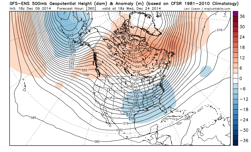 As for heading into January, we’ll see. Some of the longer range MJO plots try to suggest the MJO might become a bit more unfavorable, however for now it doesn’t look to be quite the amplitude it was over the last couple of weeks. In addition, the GFS and Euro have both been hinting at some good warming in the lower portions of the stratosphere (100-50mb) during the latter third of December for a few runs now, with some signs of the vortex becoming disturbed. If that persists, that could correlate to a more –AO heading into January. If western N. America ridging does in fact develop over the last third of the month like the ensembles are currently insisting on, this could allow for a much colder weather pattern to develop at some point between January 1 and 10. We’ll see: