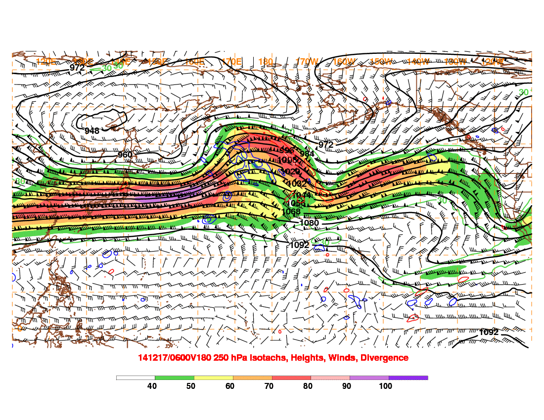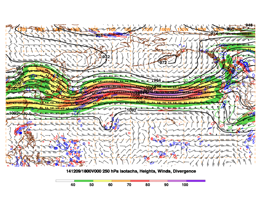 At 180 hours, the strongest of the jet is focused over eastern Asia and into the western Pacific, with favorable divergence over the NW Pacific, supporting storminess near the Aleutian Islands or just west, which does support a ridge developing along the West Coast thereafter: