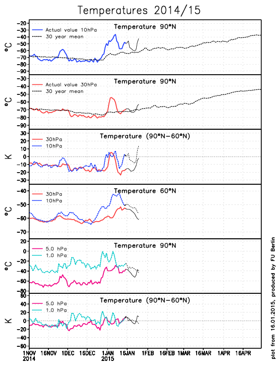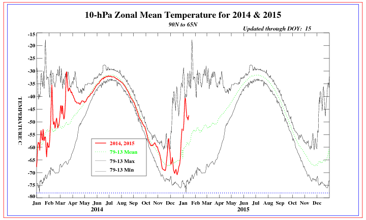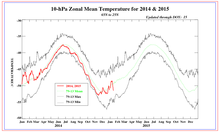 Note how temperatures in the arctic stratosphere briefly warmed to near the daily record values at the 10mb level, although they have cooled some since the warming. This does NOT count as a MWE. Temperatures in the mid-latitude stratosphere have cooled in this timeframe, suggesting a weakening of the stratospheric polar vortex: