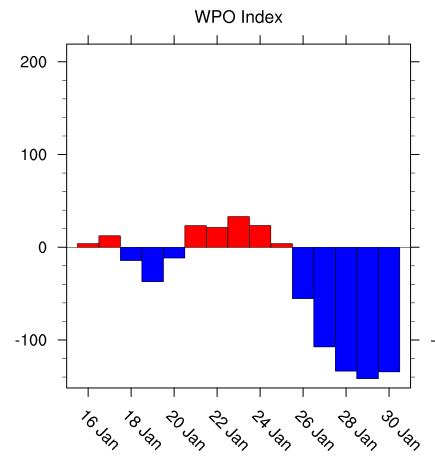Another factor supporting continued ridging here is the expected continued –WPO in the mid-long range. The WPO or West Pacific Oscillation describes the height pattern in the northwestern Pacific…here is a look at the positive phase graph:
