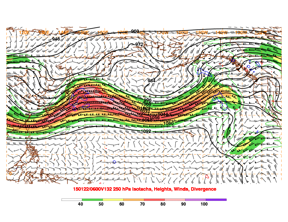 After starting January with extremely active convection in the tropical Indian Ocean, which eventually contributed to the strong ridge on the West Coast and into Alaska discussed above breaking down, the convection is now most active over the Pacific Ocean. This is favorable for ridging over western North America, because the convection located over the Pacific favors a strong jet stream over the western and central Pacific that breaks over the eastern Pacific, causing storms there that increase heights (cause a ridge to develop) along the West Coast. You can see this favorable jet orientation on the GFS forecast valid Sunday morning: