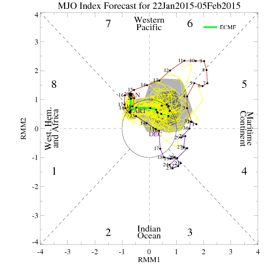 The Pacific jet is shown by the GFS to retract a bit again late next week, which so far this winter, has been good at developing ridging over the western portion of North America. In addition, a trough persists over eastern Asia. This suggests continued ridging over the high-latitudes in the north-central Pacific (-WPO). With the MJO likely remaining fairly weak for the next week to 10 days, I don’t see much to mess up the extensive ridging expected to develop in the WPO and EPO, and probably PNA regions by the end of next week. This has been expected for quite some time and remains fairly consistent on our models. For reference, the Euro’s MJO forecast for the next two weeks…mainly in the circle of death, and then possibly coming out weakly into phase 6 in early February: