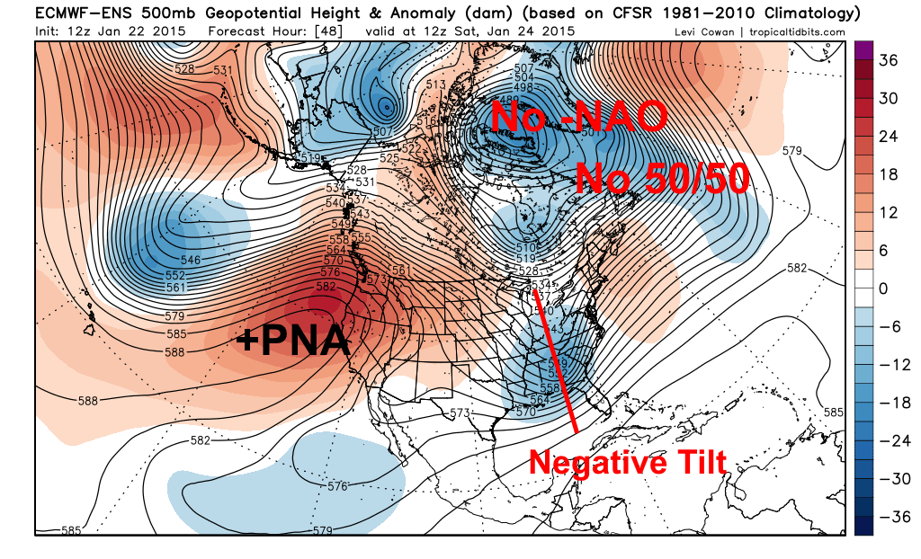 There is good model agreement in the trough associated with this storm taking on a negative tilt Friday night into Saturday morning as it passes over the Appalachians. This IS where East Coast snow fanatics want to see the trough take on a negative tilt…however, there are some issues that will limit the potential snowfall amounts with this storm, mainly involving the Atlantic side of the large scale pattern…with no real blocking over Greenland and the NW Atlantic (the attempt at a weak east-based –NAO isn’t very helpful here), the airmass will be marginally cold for snow, especially closer to the coast, and the trough with the storm will be more progressive than is preferable, meaning precipitation will pull east just as the storm tries pulling cold air in.