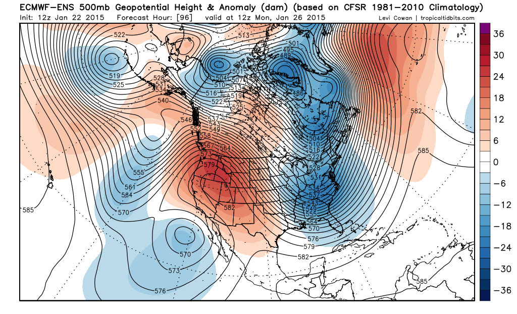 After all of this storminess over the eastern US this week and into the beginning of next week, the teleconnections strongly argue for a brief relaxation in the troughing over the eastern US. A +NAO corresponds to low pressure over Greenland, which leaves room for a ridge over the eastern US, while a +AO corresponds to low pressure over the North Pole, which typically keeps colder air locked up to our north. A negative PNA corresponds to a trough on the West Coast, which also corresponds to ridging east of the Rockies. As terrible as this pattern sounds for snow in the eastern US, the relaxation in the cold looks brief…although, the Euro ensembles agree close enough with the above teleconnections and suggest a brief warming across much of the central and eastern US for late next week: