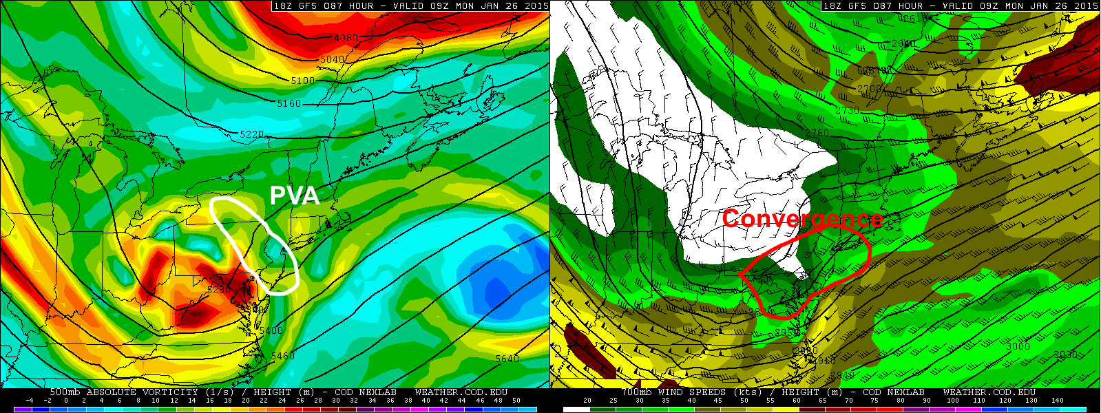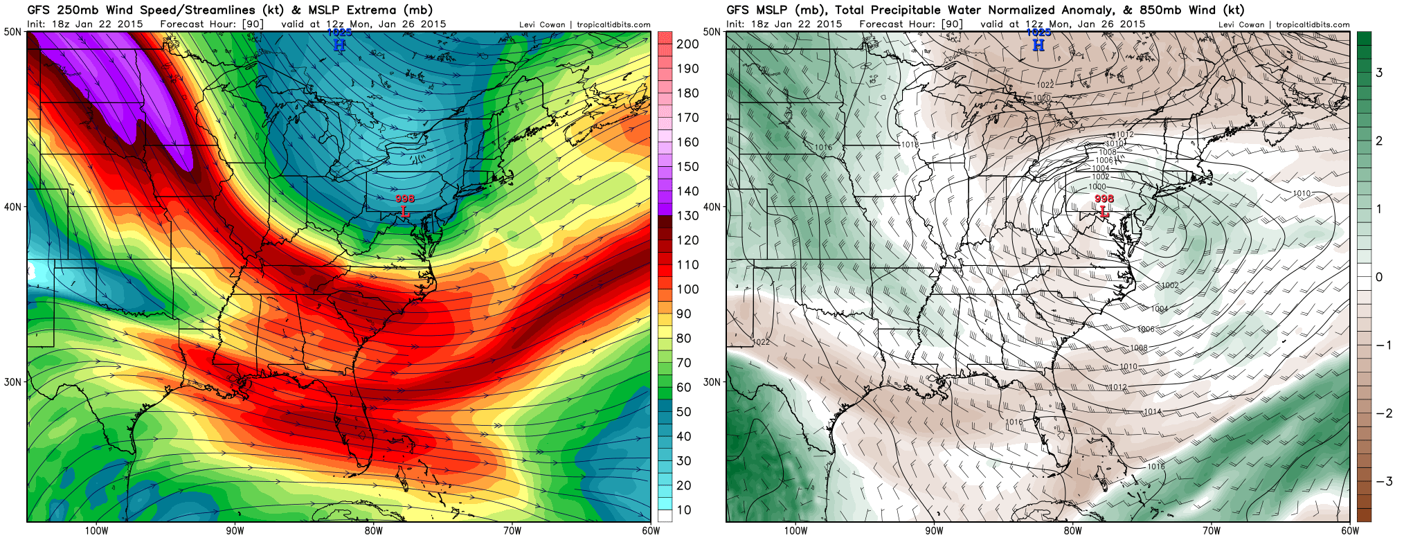 When taking a look at factors that may determine how quickly this low strengthens as it hits the East Coast, things are not nearly as favorable as they will be on Saturday. Although there is some upper-level jet support (left) from the left-exit quadrant of a jet stream rounding the base of the trough, and a little bit from the right-entrance quadrant of a jet streak to the northeast of the storm, the jet is not nearly as strong as what is expected on Saturday along the East Coast. In addition, note how PWAT values are much lower on Monday morning as the low pressure begins transferring to the coast, which suggests a more stable atmosphere. This, along with the trough only beginning to take on a negative tilt as it reaches the East Coast, suggests that a rapidly deepening low pressure system seems unlikely. Even with all of this “bad talk”, this is still a very potent clipper coming down, so there will be some mechanisms in place Sunday night into early Monday across parts of the Mid Atlantic and possibly southern New England to get heavy snow to occur: