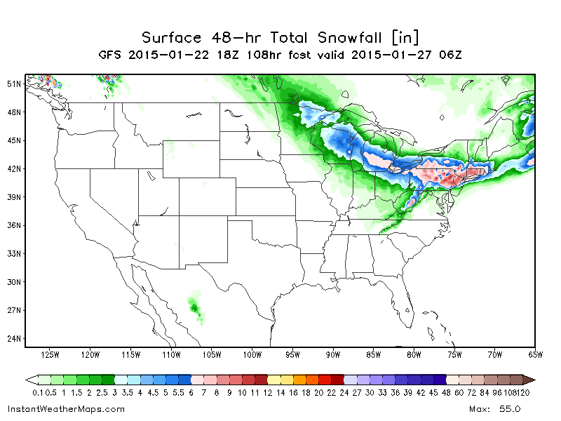 The European model, although I can’t show it, shows a swath of much lighter snow a little farther south than the GFS, along the lines of 3-6” across parts of the Great Lakes and 2-4” or so across the Mid Atlantic.