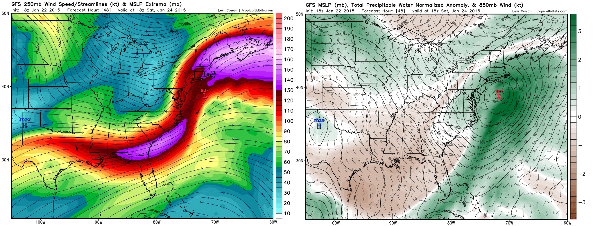 Regardless, there is good model agreement on high PWAT (perceptible water) air wrapping into the low pressure system off the East Coast on Saturday with great upper level divergence from a 160 knot upper level jet streak, so a rapidly deepening low pressure system off the East Coast on Saturday seems like a good bet: