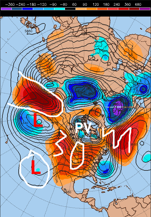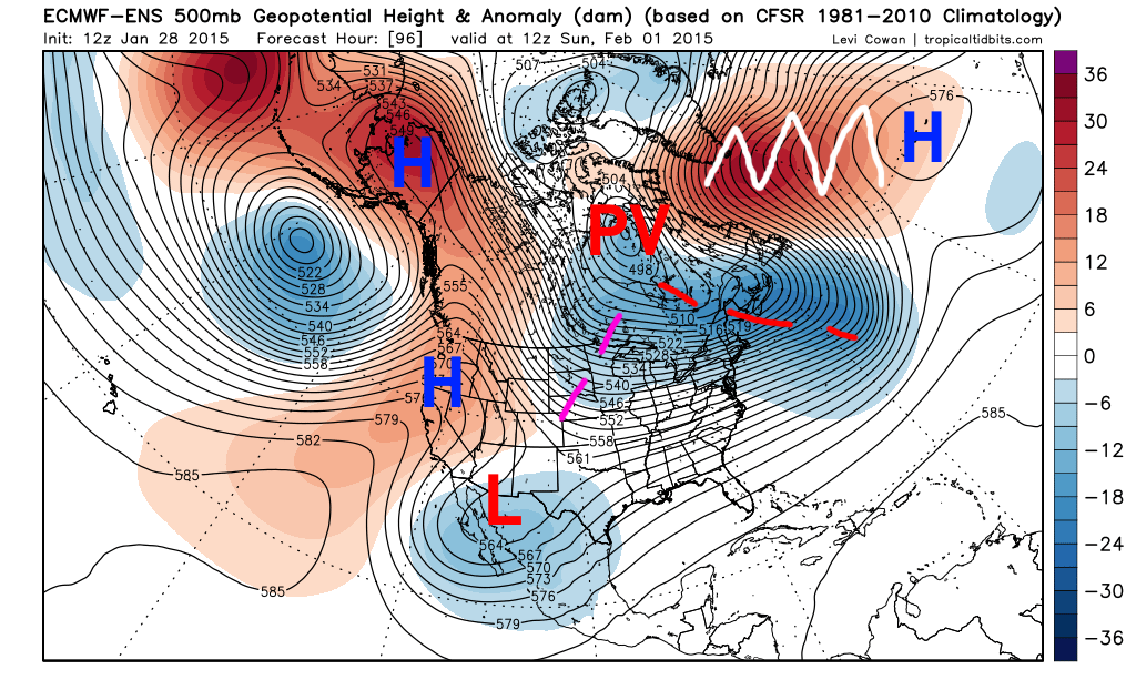 The reason I believe a stronger storm is possible is mainly due to the large upper level ridge of high pressure on the west coast combining with the polar vortex over Hudson Bay causing a high-amplitude north-northwest flow over Canada into the Rockies. This could conceivably force the shortwave diving into the Rockies on Saturday (denoted by the purple lines) to dive in more aggressively and farther southwest, which would allow it to help kick-out the cutoff low over the SW US/towards Baja, and help contribute to a bigger storm.