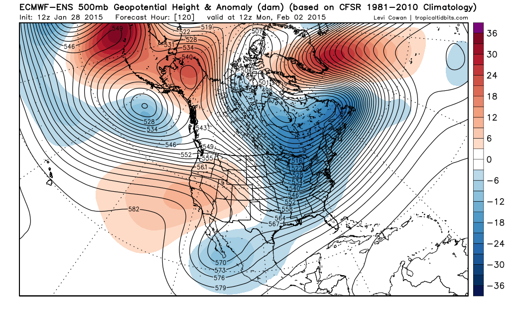 If the storm doesn’t cut too far north while west of the Appalachians, the pattern is favorable for decent snows in New England and the Mid Atlantic (12z Wednesday Euro ensembles shown above for Monday morning). This is due to a –NAO (reds extending towards Greenland) and low height anomalies over Newfoundland acting as a 50/50 low…features that were missing when the blizzard ended up whiffing the Mid Atlantic Monday and Tuesday of this week.