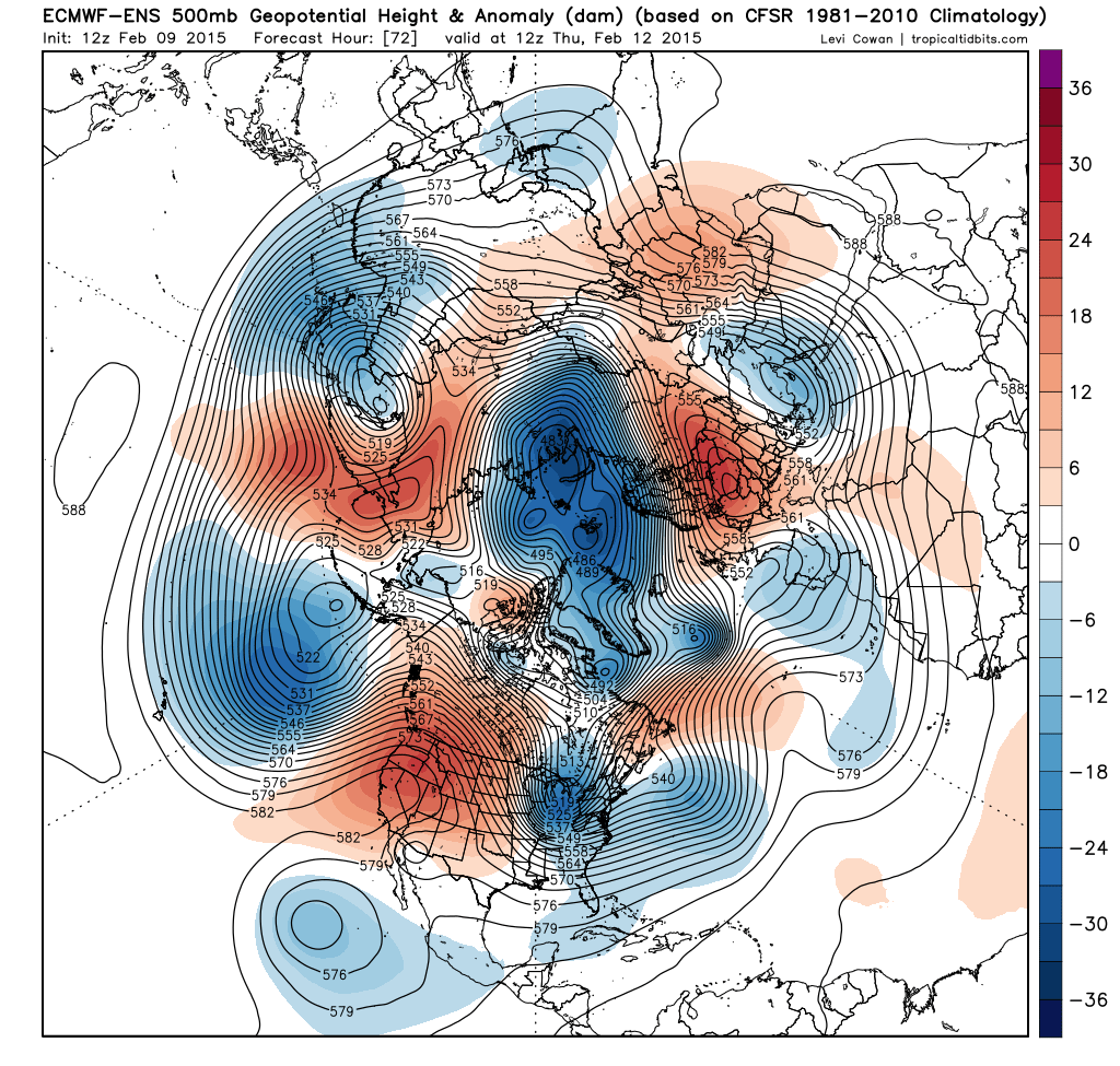 By Saturday, the ensembles (ECM ensembles shown above) agree on a classic pattern for delivering cold into the central and eastern US setting up. The +PNA ridge extends all the way into Alaska and can qualify as a –EPO…in addition, a strong –WPO persists. All of this ridging forces a classic cross-polar flow. Cross-polar flows typically mean very cold weather into the northern US, and the cross polar flow modelled for this weekend is one of the best I’ve ever seen over the last several years. Note how the isohypses on the map above run right across the North Pole and then straight down into the Great Lakes. That’s cold stuff, and well below 0 temperatures appear to be a good bet across portions of the Great Lakes and New England.