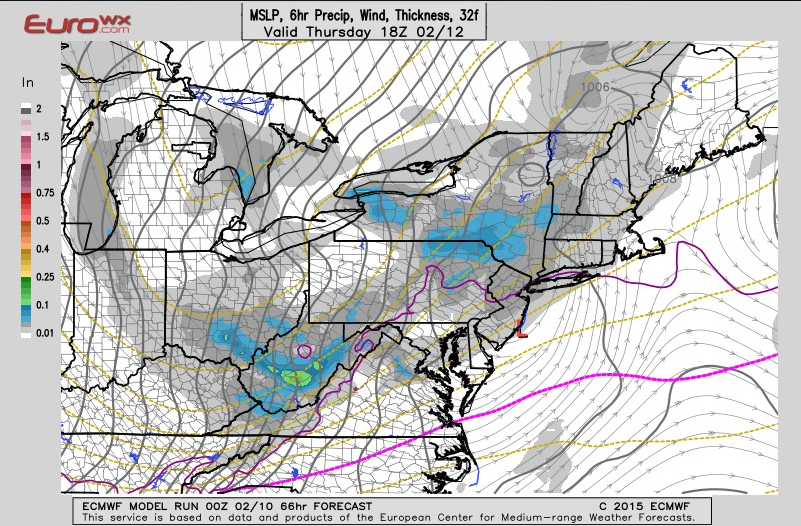 The Euro, valid at 1PM Thursday, has a similar idea with a trough dropping across Lake Erie. The difference is, the GFS/NAM maintain a more WNW wind Thursday morning ahead of the trough, while the Euro shows a more NW wind ahead of the trough. Winds should go more NW or NNW behind the trough per all models.