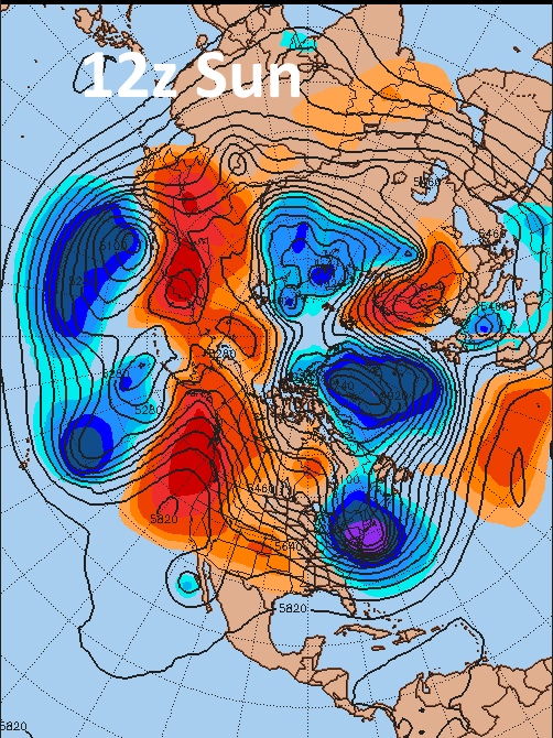 When panning out to the entire hemisphere now, there is some hope for the mess off the East Coast to get out of the way. There is no –NAO, in fact it is strongly positive due to lower heights over Greenland and Iceland. There is still plenty of room for the Nor’easter to swing out well to the northeast over the next day, and in fact when comparing the map from 12z/8AM Sunday for the hemisphere to the closer in map from 20z/3PM of the US, you can see that the trough with the Nor’easter has already swung off the New England coast, with heights rapidly riding to the west.