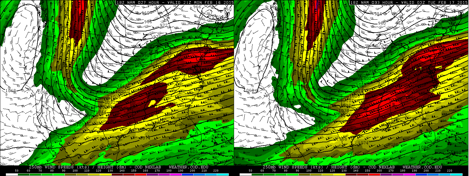 When looking at the jet stream (250mb level) on the NAM, Athens will be in a favorable region of upper level divergence (which is a source of lift) from Monday afternoon into Monday evening. Z time (the time stamps in the upper right corner) is EST plus 5 (Z time is five hours ahead of EDT, so 21z is 4PM EST). Both the right-entrance quadrant of a departing jet streak and left-exit quadrant of a jet streak running to our south will provide large scale lift to the area. This helps explain how there’s a low pressure system running across the Deep South (with the favorable lift on the southwestern side of the jet streak to our south) while there’s snow in the Ohio Valley (with lift from two jet streaks) at the same time.