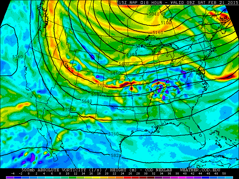 This next loop compares the 15z, 18z and 21z RAP valid at 9z Saturday morning, to see if trends in the short term model can shed any light on the situation. The model has noise level changes in heights east of the shortwave, but on the whole trended a little stronger with the shortwave over the Plains. This could suggest heavier precipitation getting a little farther north over the Ohio Valley when the shortwave comes east due to a slightly stronger shortwave and slightly better southwest flow ahead of it.