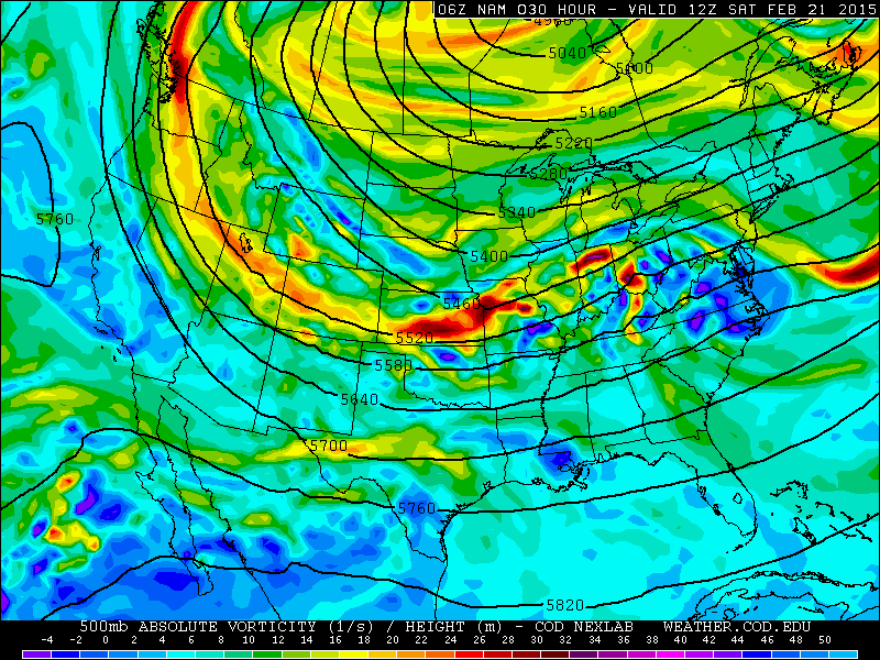 The shortwave that will swing out into the Plains tonight and across the Ohio Valley is currently over the four corners region. There is some confluence over the NE US, however due to a lack of a –NAO that is pulling away to the east. This would normally give our storm some room to track north, but the meager nature of the shortwave will prevent a strong north push.