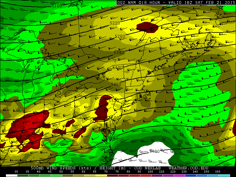There will be very impressive upper level divergence across the Ohio Valley thanks to two jet streaks working in tandem. We will be in the right-entrance quadrant of a jet streak to our north, and the left exit quadrant of a jet streak to our south, with clear upper level divergence on the image above. Note how the wind barbs “fan out” over the Ohio Valley…also note how there are two areas of stronger winds splitting apart. This indicates strong large scale lift across the region for much of the day Saturday.