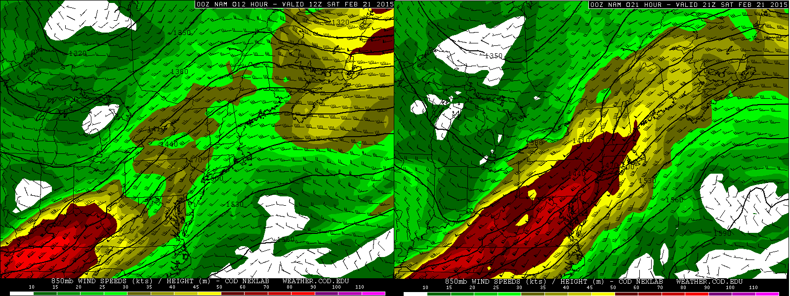 Looking at the 850mb level, there is a very impressive low level jet here transporting in warmer and more moisture laden air into much of southern and eastern OH. The nose of the 850mb jet corresponds to both the nose of the 700mb jet and the first surge of 500mb lift Saturday morning…the stars are aligning for a burst of heavy precipitation in southern/central OH Saturday morning. Even through Saturday afternoon, the northern portion of the low level jet should continue to supply some boost to the precipitation over southern and eastern Ohio, although not to the extent it will in the morning.