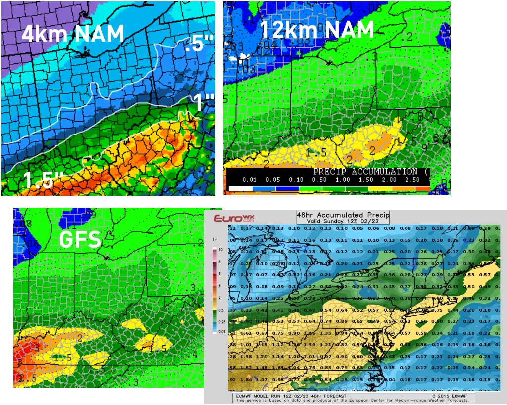 The NAM is generally more aggressive than the Euro and GFS with QPF. The GFS and Euro agree well, however what I discussed above does suggest increasing QPF a little bit over the GFS and Euro over central and especially southern Ohio.