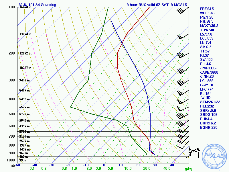 The 12z and 15z RAP both show the OFB plunging well south over western TX with little recover over the panhandle…I do not think this is realistic as the current storms are semi-discrete, elevated, and moving ENE away from the panhandle. Regardless, south of the OFB and near the dry line, the RAP does show sufficient CAPE and bulk shear for supercell development by this evening over west TX: