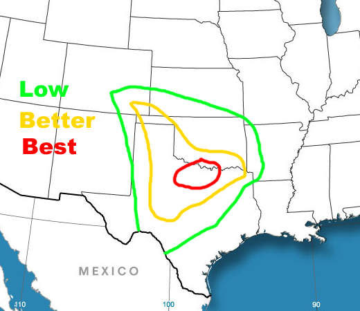The threat farther west along the dry line is more conditional. As last night, if I had to assign SPC style probabilities to the zones of tornadoes within 25 miles of a point, I’d go 2% green, 5% yellow, 10% red.