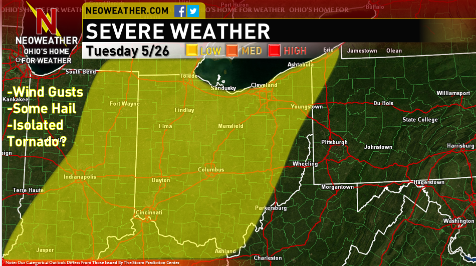 I believe the combination of factors necessitates a low risk across much of the state for Tuesday afternoon/evening. Instability won’t be particularly strong due to weak mid-level lapse rates, however some suggestion for linear storm organization in western OH during the late afternoon/early evening that spreads east and a reasonable low level jet combined with the potential for some discrete cells farther east that may have a window to become supercells with a marginal hail risk and potentially a small tornado risk closer to Lake Erie all supports a low risk. In SE Ohio, the convection will likely arrive later in the evening with weaker bulk shear due to greater distance from the upper level speed max, so I left that area out of the low risk.