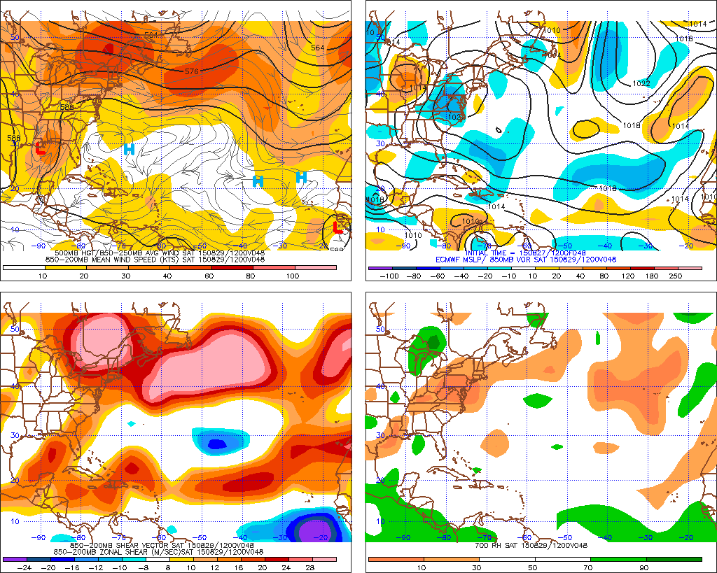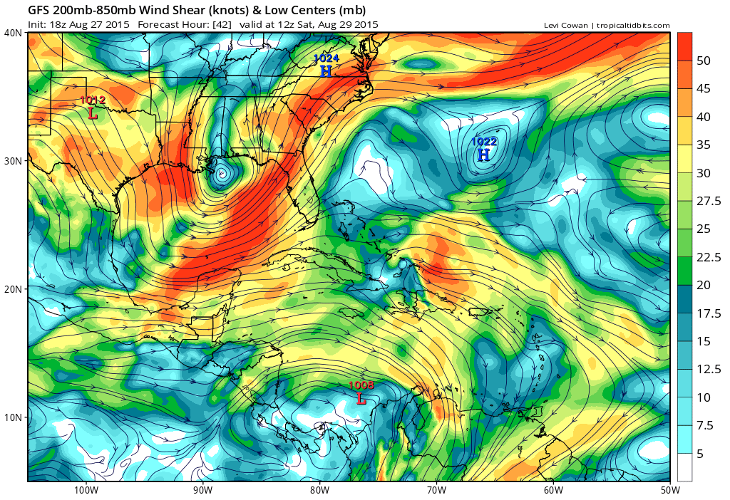 By Saturday morning, the GFS still continues to start weakening shear over Erika as it moves over the Turks and Caicos. There is still some light to moderate westerly shear over the system at this time, but note how shear is beginning to relax near the system, with winds starting to fan out away from it, indicative of good outflow. The 12z Euro also shows a similar idea Saturday morning: