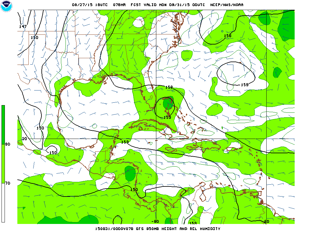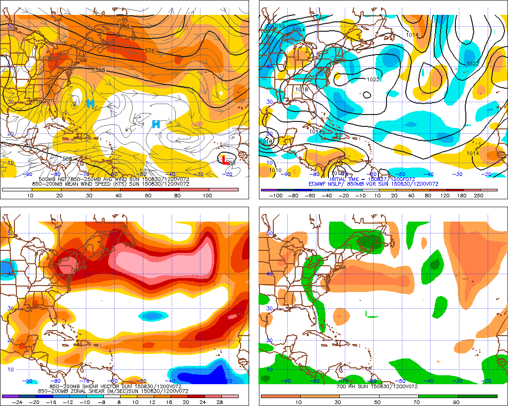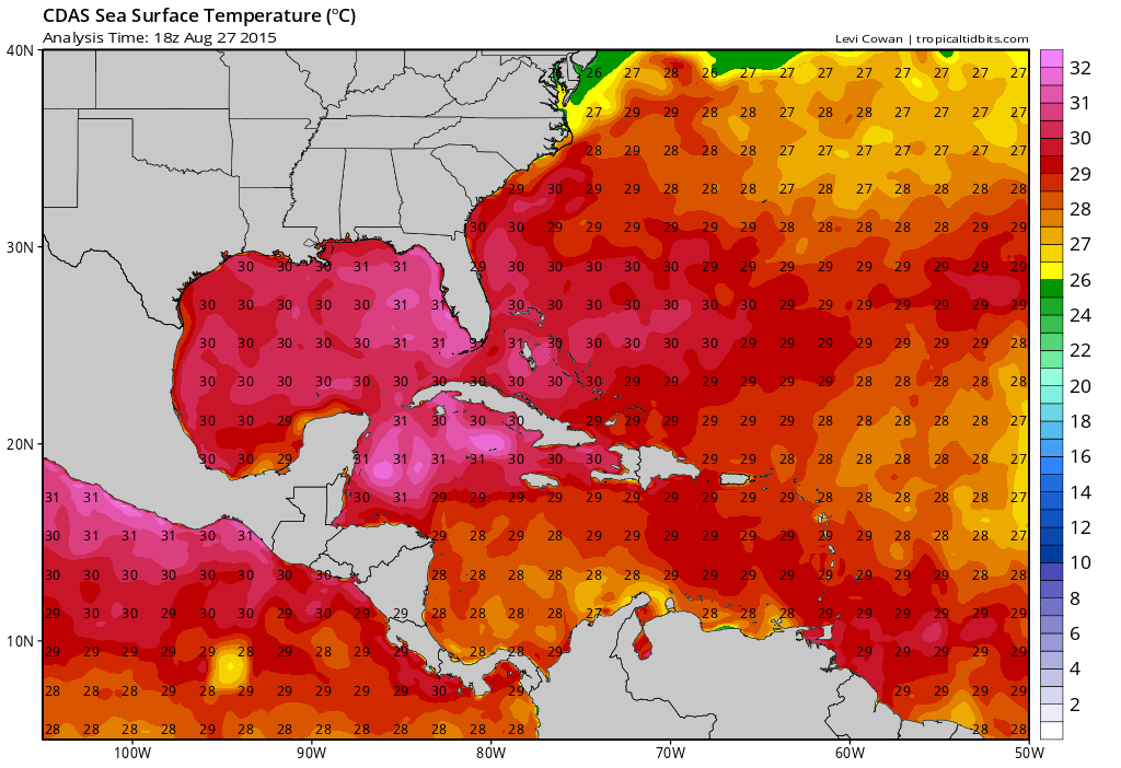Sea surface temperatures ahead of Erika increase to 29-31C (84-88F) over the Bahamas and off the Florida and southeast US coast, and as I discussed in my previous post these warm waters exist to deep depths, meaning there is plenty of fuel for a tropical cyclone in this area and that cooler waters wouldn’t quickly upwell under the system and slow intensification.